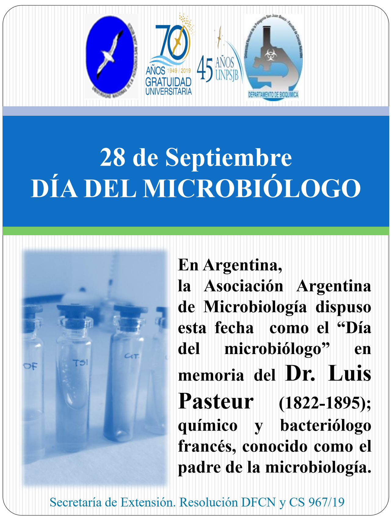 La Facultad De Ciencias Naturales y Ciencias de la Salud, de la U.N.P.S.J.B., en la Dirección Docentes, llama a inscripción de aspirantes para cubrir cargo/s docente/s interino/s, durante el Ciclo Lectivo 2020”, únicamente en los departamentos de BIOQUIMICA y QUIMICA según se detalla: