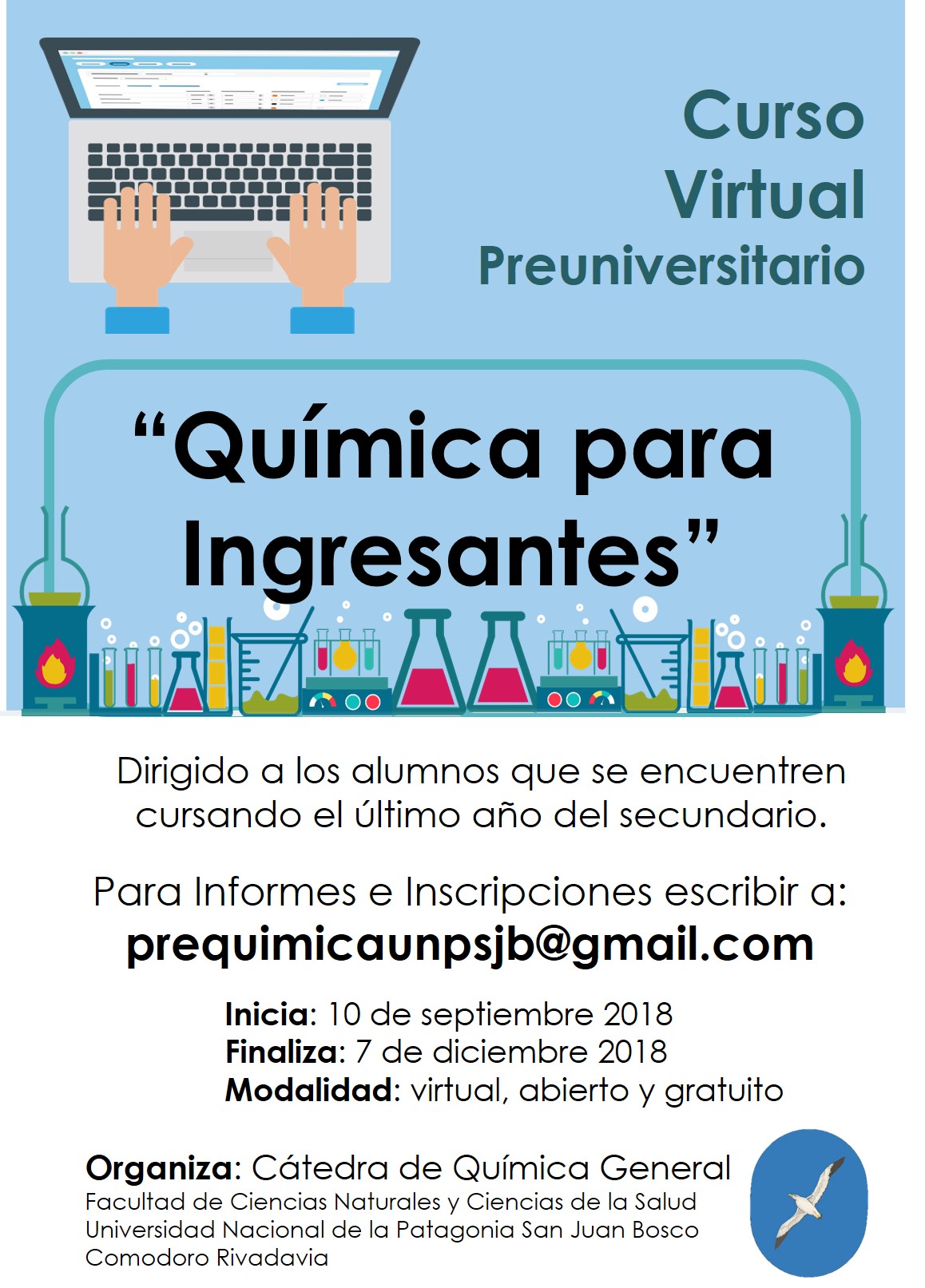 El curso será ofrecido por la Cátedra de Química General (Sede Comodoro Rivadavia), perteneciente a la Facultad de Ciencias Naturales y Ciencias de la Salud, UNPSJB. Está dirigido a estudiantes que estén cursando el último año del secundario, con el objetivo de repasar y revisar los conceptos de química vistos y lograr una mejor preparación para el comienzo de una carrera universitaria que así lo requiera.