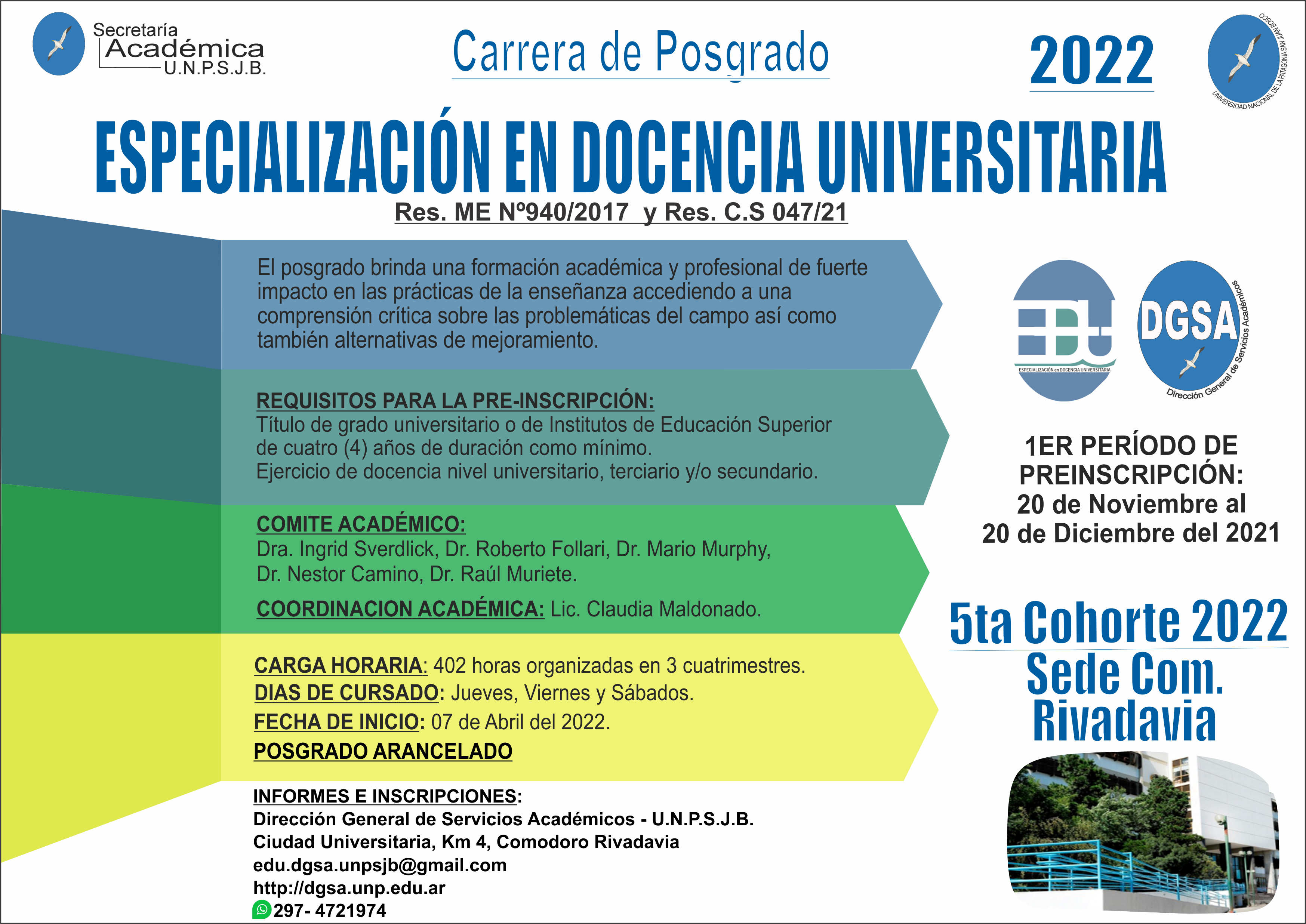 A partir del 14/02/22 al 25/03/22 se realizará la inscripción de manera presencial con turnos previos, para solitarlo enviar un email a Esta dirección de correo electrónico está protegida contra spambots. Usted necesita tener Javascript activado para poder verla.