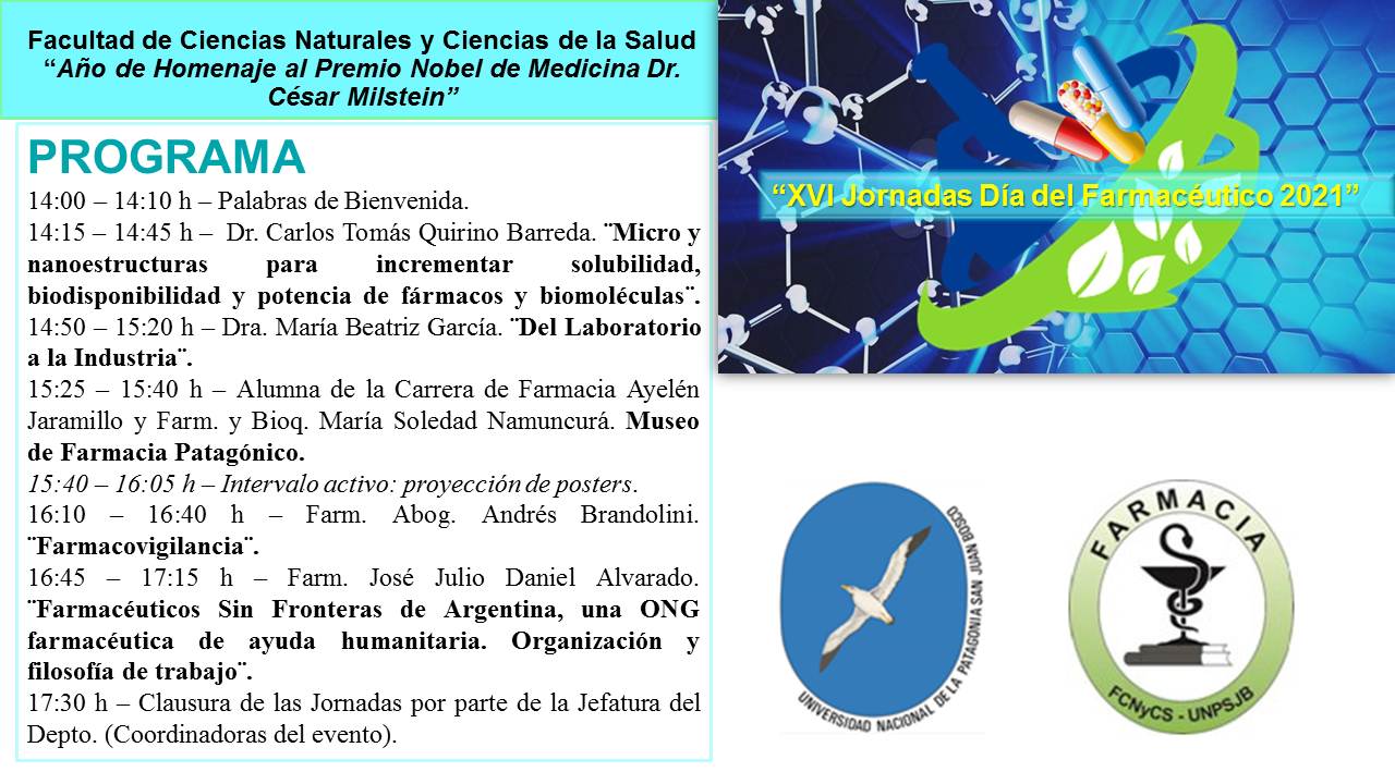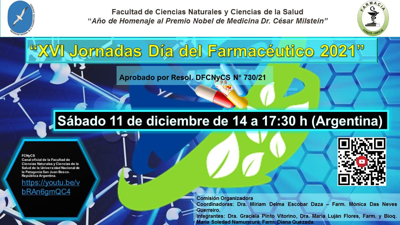 La Facultad de Ciencias Naturales y Ciencias de la Salud los invita a participar de las ̈XVI Jornadas Día del Farmacéutico 2021 y destaca la amplia contribución de los profesionales farmacéuticos en la investigación, desarrollo y producción de medicamentos y diferentes productos para la salud.