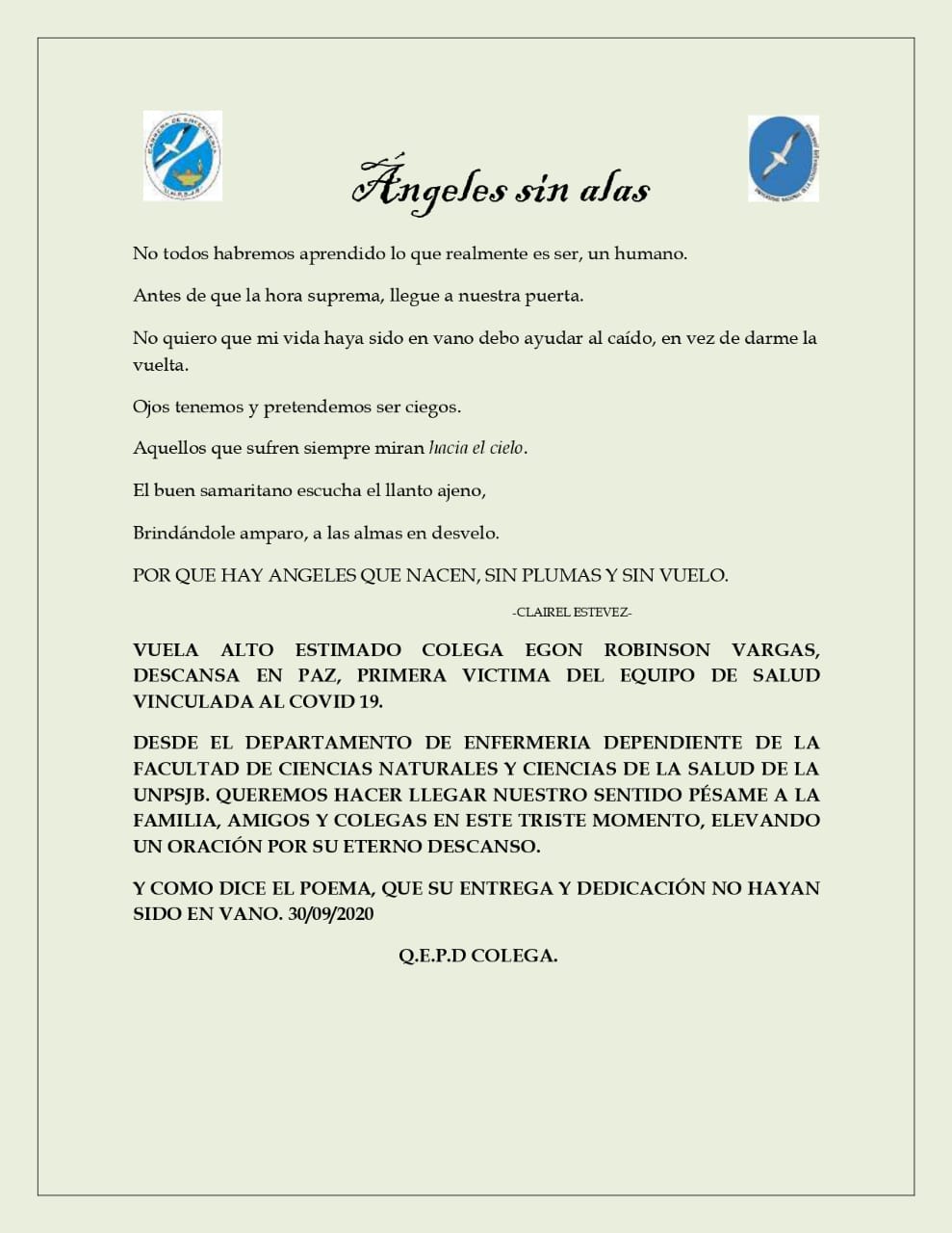 Falleció el 15/10/2020, a los 60 años. El Equipo de Gestión de la Facultad de Ciencias Naturales y Ciencias de la Salud de la UNPSJB, acompaña a la Secretaria de Posgrado, Dra. Susana Risso rogando porque encuentre pronto consuelo y resignación.