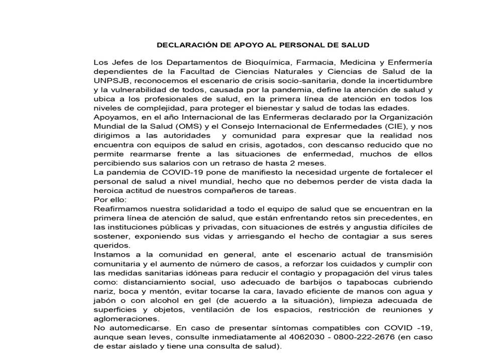 El equipo de gestión de la Facultad de Ciencias Naturales y Ciencias de la Salud adhiere a la Declaración de apoyo al personal de salud que los jefes del departamento comparten.