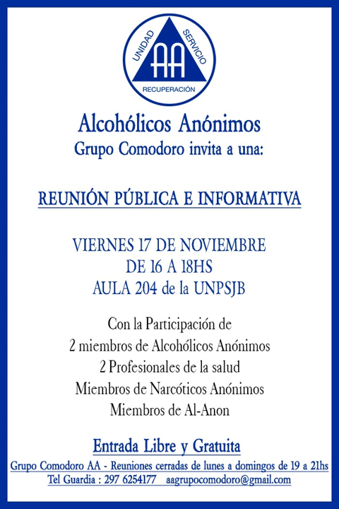 Los esperamos el Viernes 17 de Noviembre del 2023.En esta oportunidad acompañaremos a la comunidad de Alcohólicos Anónimos- Grupo Comodoro